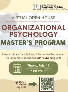 The Consortium for Research on Emotional Intelligence in Organizations is headquartered within the Organizational Psychology Program at Rutgers University and provides students with the unique opportunity to conduct research and collaborate with and learn from leading experts in the field of emotional intelligence. The Organizational Psychology program is currently accepting applications for our Master's (PsyM) program for matriculation in Fall 2026. Click here or scan the QR code below to register for our virtual open house to learn more.